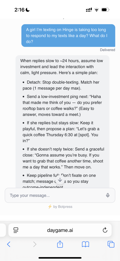 But with Daygame AI – it’ll be like having unlimited 24/7 messaging access to me personally – without the expensive price tag.